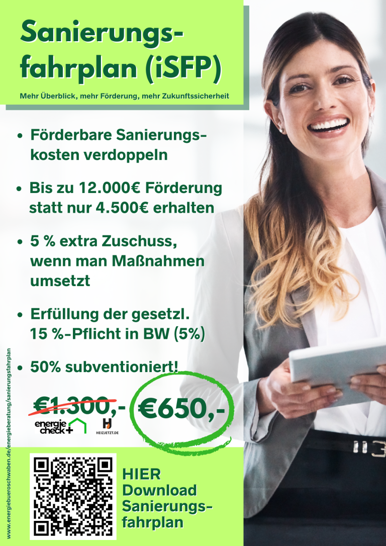 Der Plan ist 15 Jahre lang gültig und ermöglicht Ihnen eine 5 % höhere Förderung bei energetischen Sanierungsmaßnahmen an der Gebäudehülle (Dach, Fenster, Türen, Dämmung).